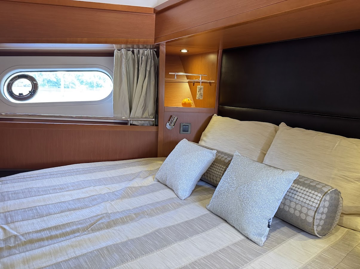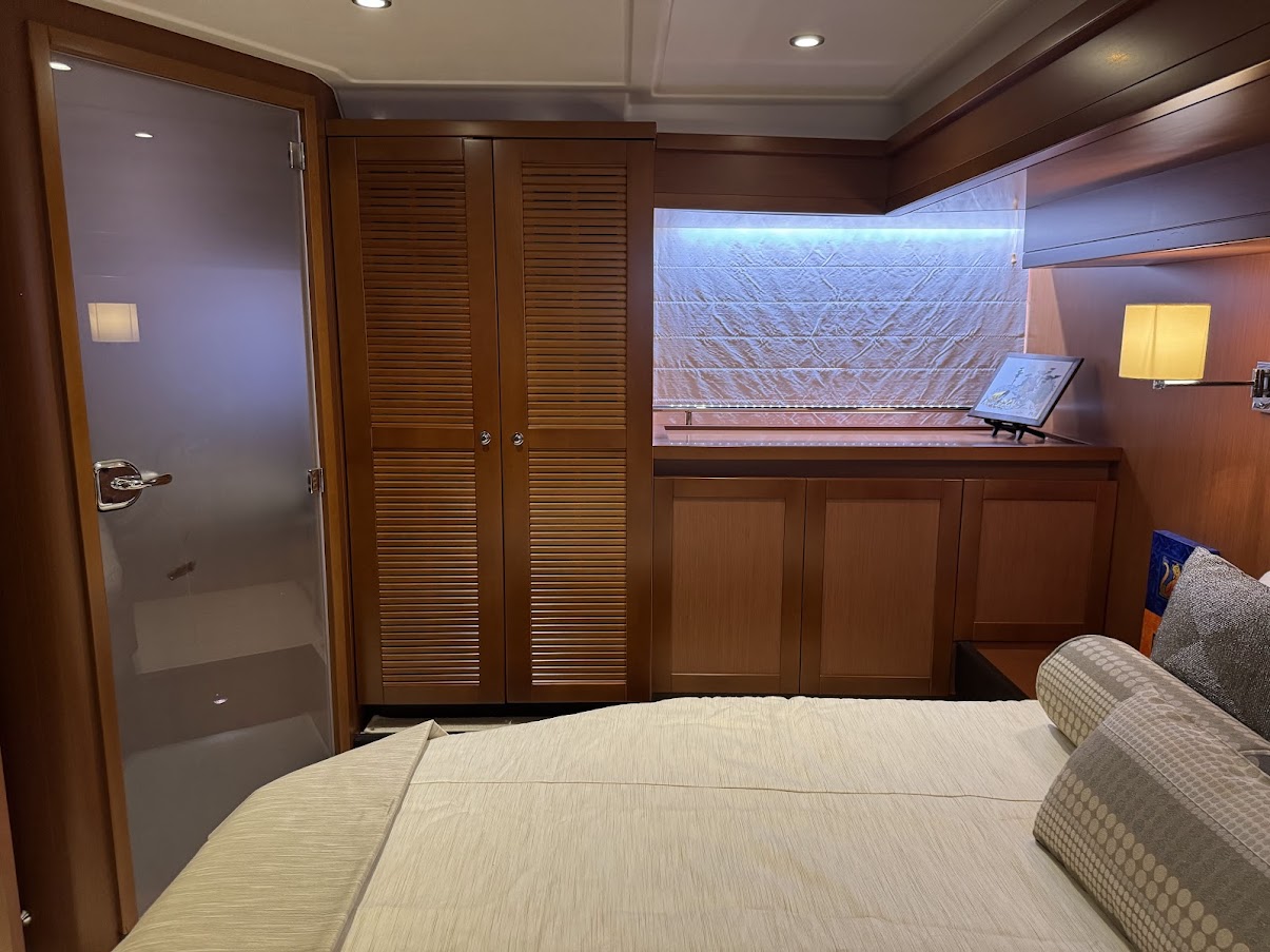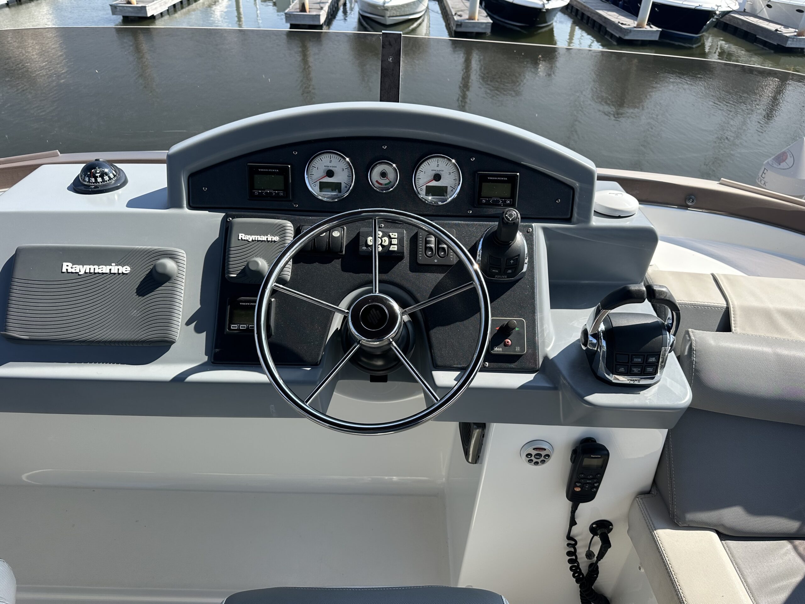 – Optional Volvo equipment: Single lever control + Onboard computer, TV and Antenna Pre wiring for every station, DVD player + Bose loudspeakers in saloon, TV, Autopilot RAYMARINE i70 RV2 in wheelhouse and repeater on flybridge, 2 Tactile multifunction screens GPS, Graphic sounder tracker RAYMARINE, E127W in wheelhouse, 1 Tactile multifunction screen GPS, Graphic sounder tracker RAYMARINE, E95 on flying bridge, Raymarine interface – Volvo EVC, Drawer refrigerator & freezer (replacing one of the two 4.6 cu.ft refrigerators), AIS650 Raymarine (Transmitter – Receiver), Dual-station Raymarine 240E VHF, Aft & Engine compartment camera, Pump for deck washing (Fresh water – 1 forward exit), Shore freshwater intake