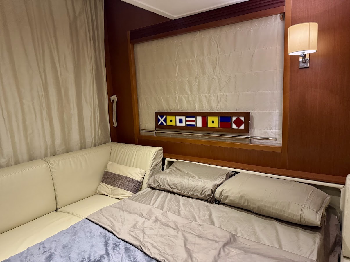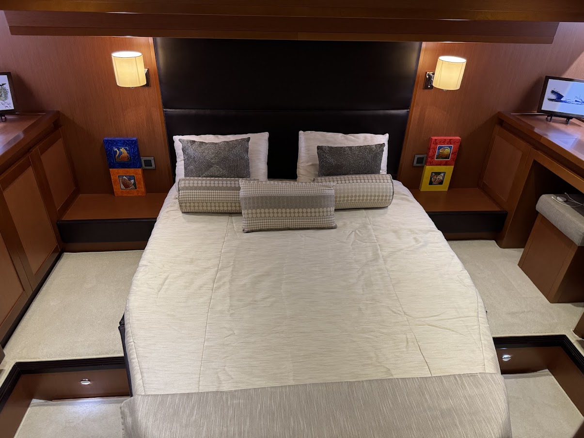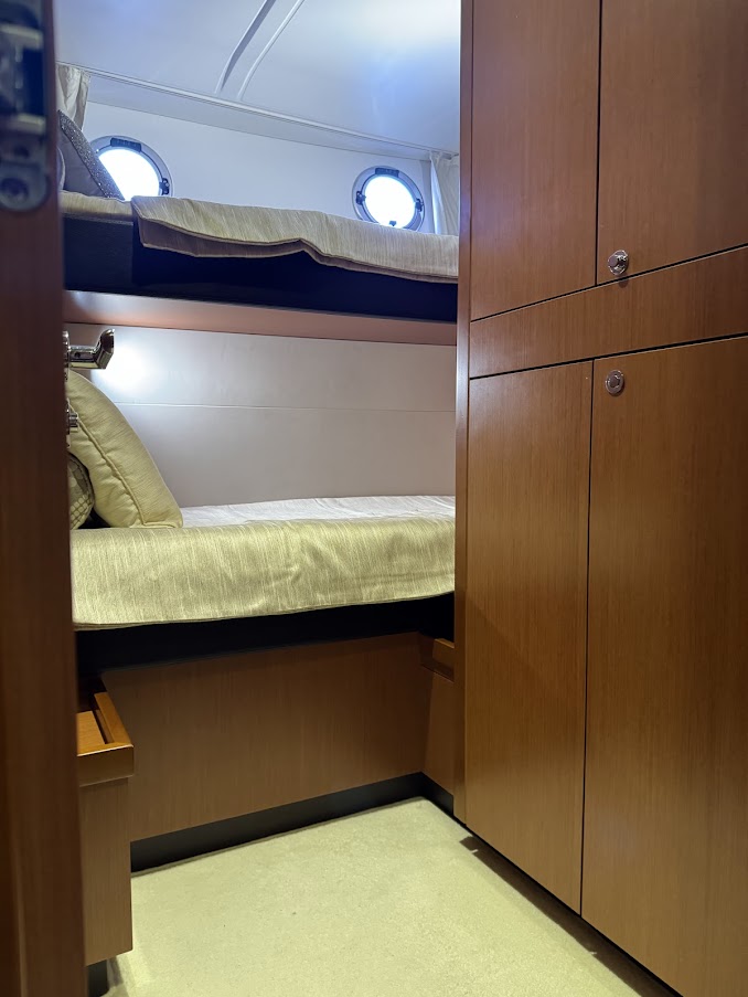 – Optional Volvo equipment: Single lever control + Onboard computer, TV and Antenna Pre wiring for every station, DVD player + Bose loudspeakers in saloon, TV, Autopilot RAYMARINE i70 RV2 in wheelhouse and repeater on flybridge, 2 Tactile multifunction screens GPS, Graphic sounder tracker RAYMARINE, E127W in wheelhouse, 1 Tactile multifunction screen GPS, Graphic sounder tracker RAYMARINE, E95 on flying bridge, Raymarine interface – Volvo EVC, Drawer refrigerator & freezer (replacing one of the two 4.6 cu.ft refrigerators), AIS650 Raymarine (Transmitter – Receiver), Dual-station Raymarine 240E VHF, Aft & Engine compartment camera, Pump for deck washing (Fresh water – 1 forward exit), Shore freshwater intake